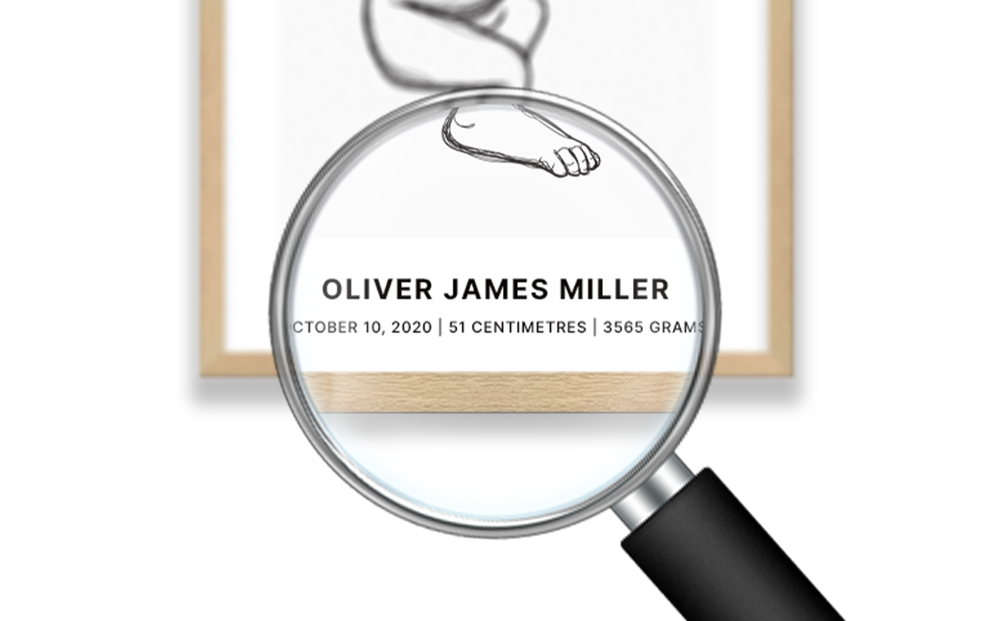 Personalise your Birth Poster with your baby's name, date of birth, size, and weight in a few simple steps.